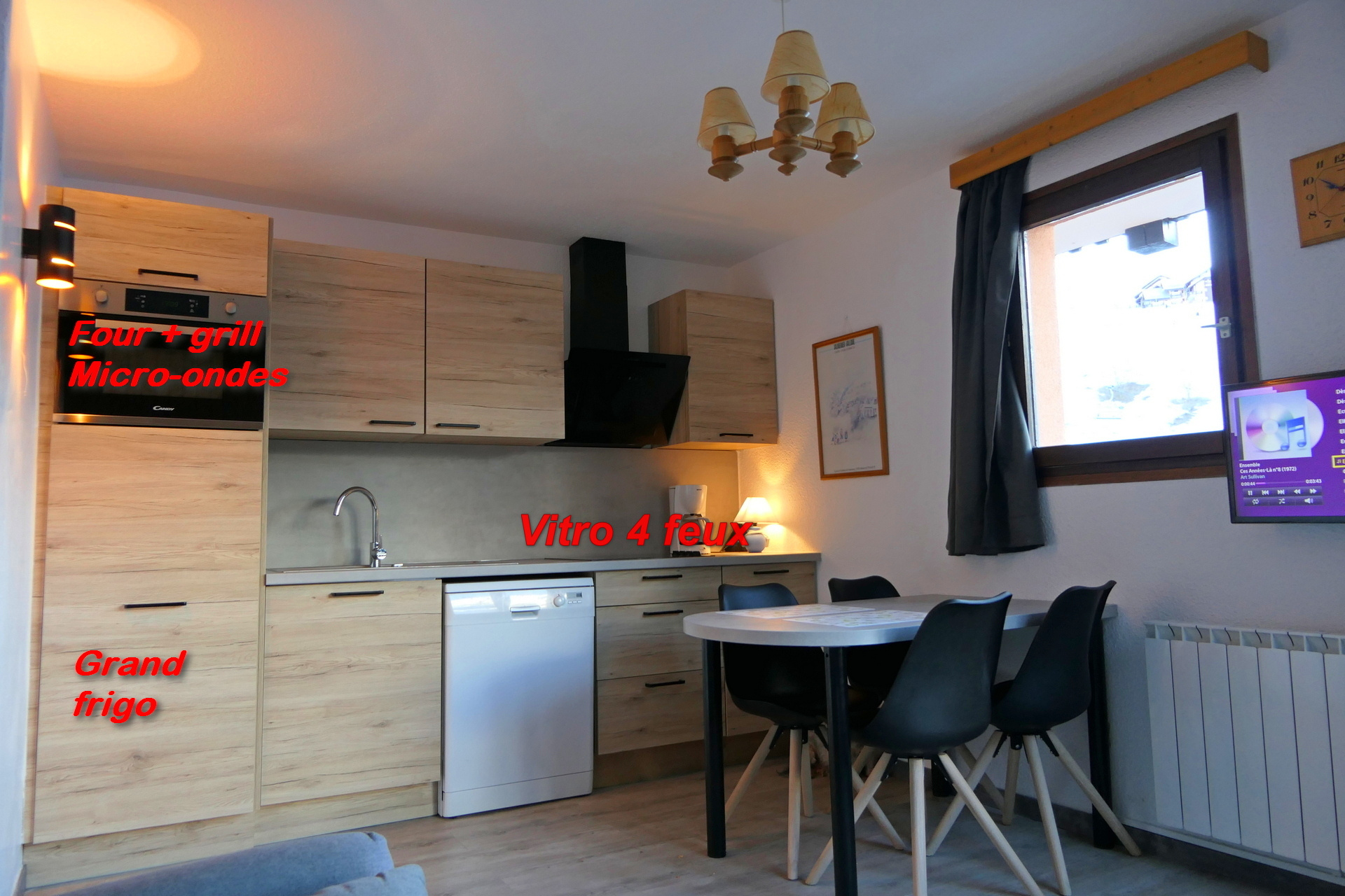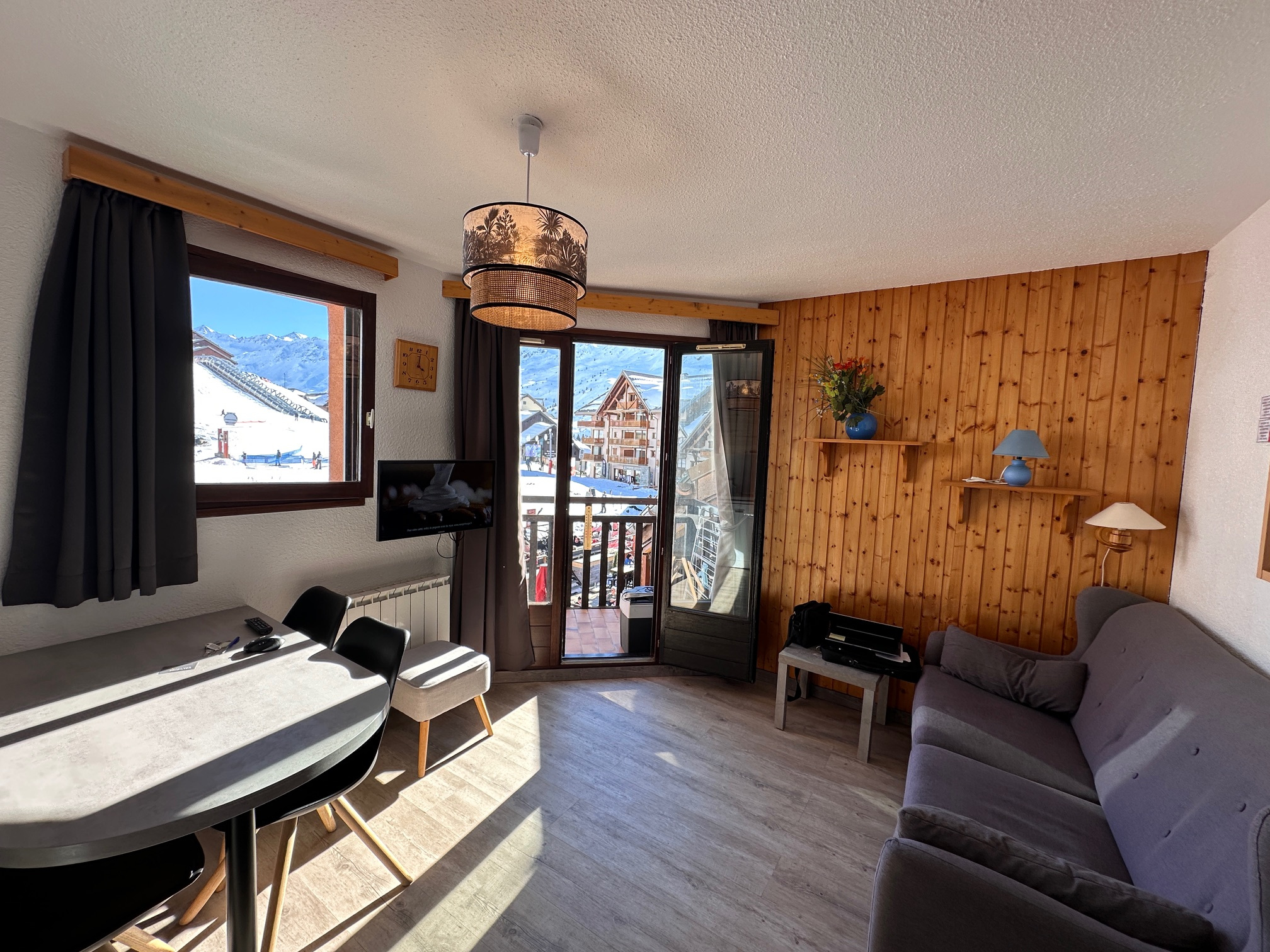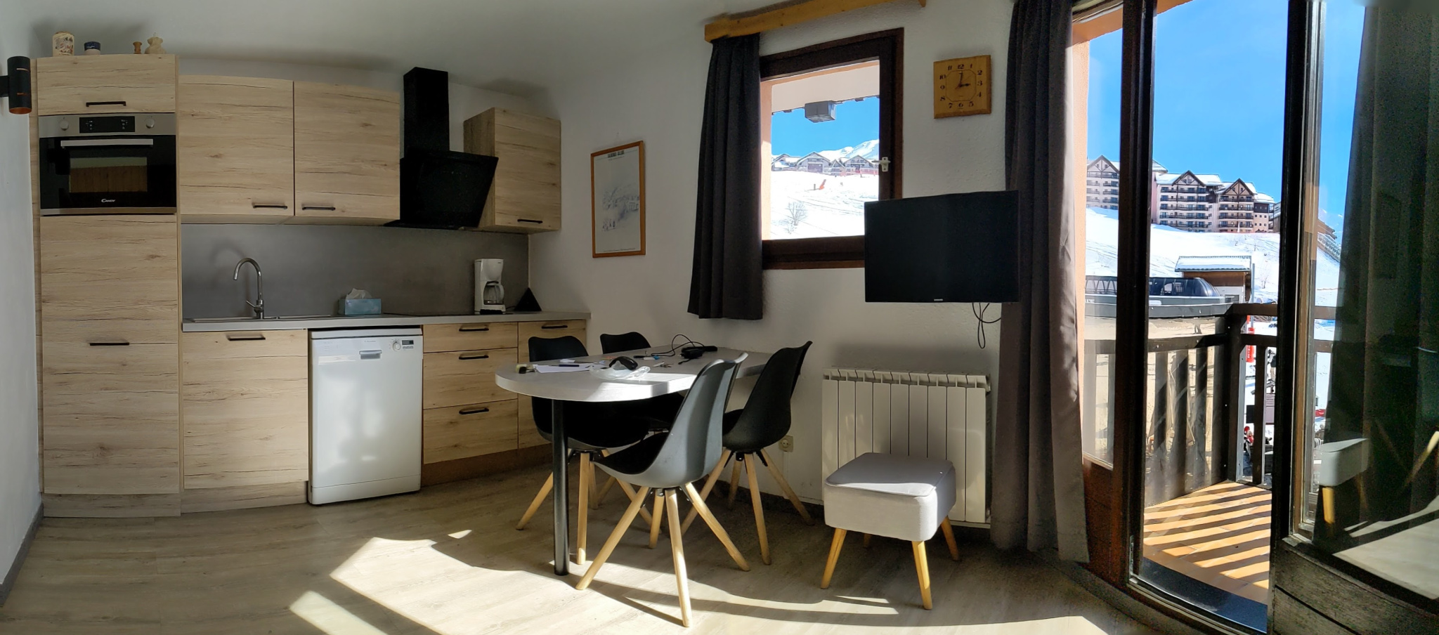 L'appartement comprend une entrée avec un coin montagne, une chambre, une salle d'eau, un WC séparé, un séjour avec cuisine donnant sur un balcon expositon Sud et une vue imprenable sur les pistes
