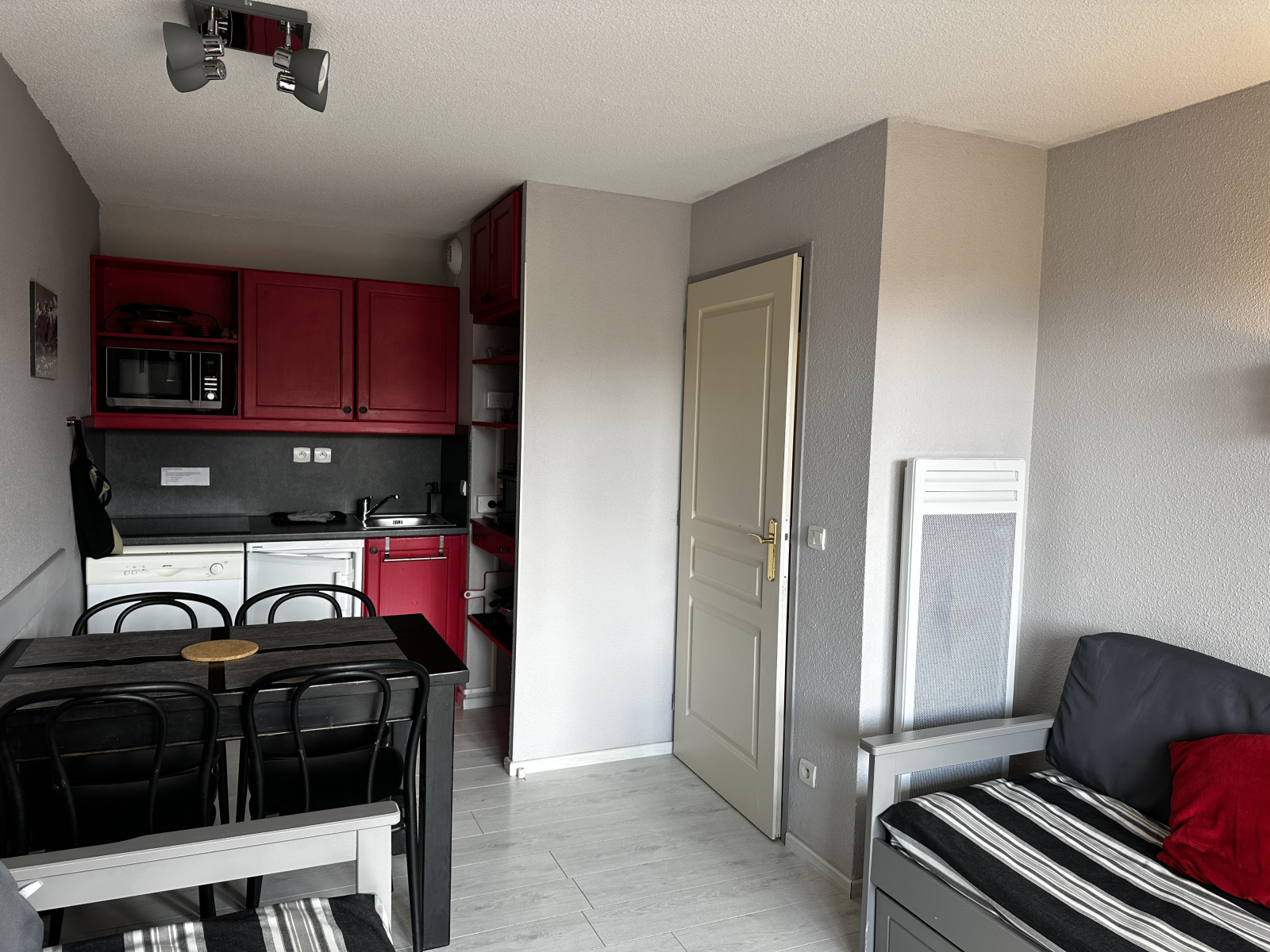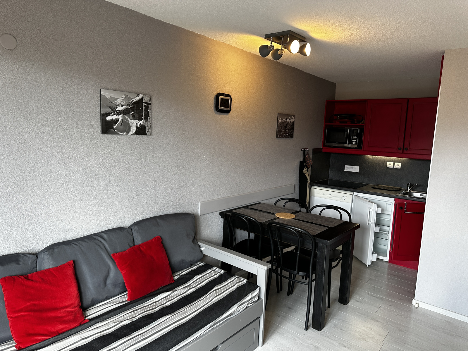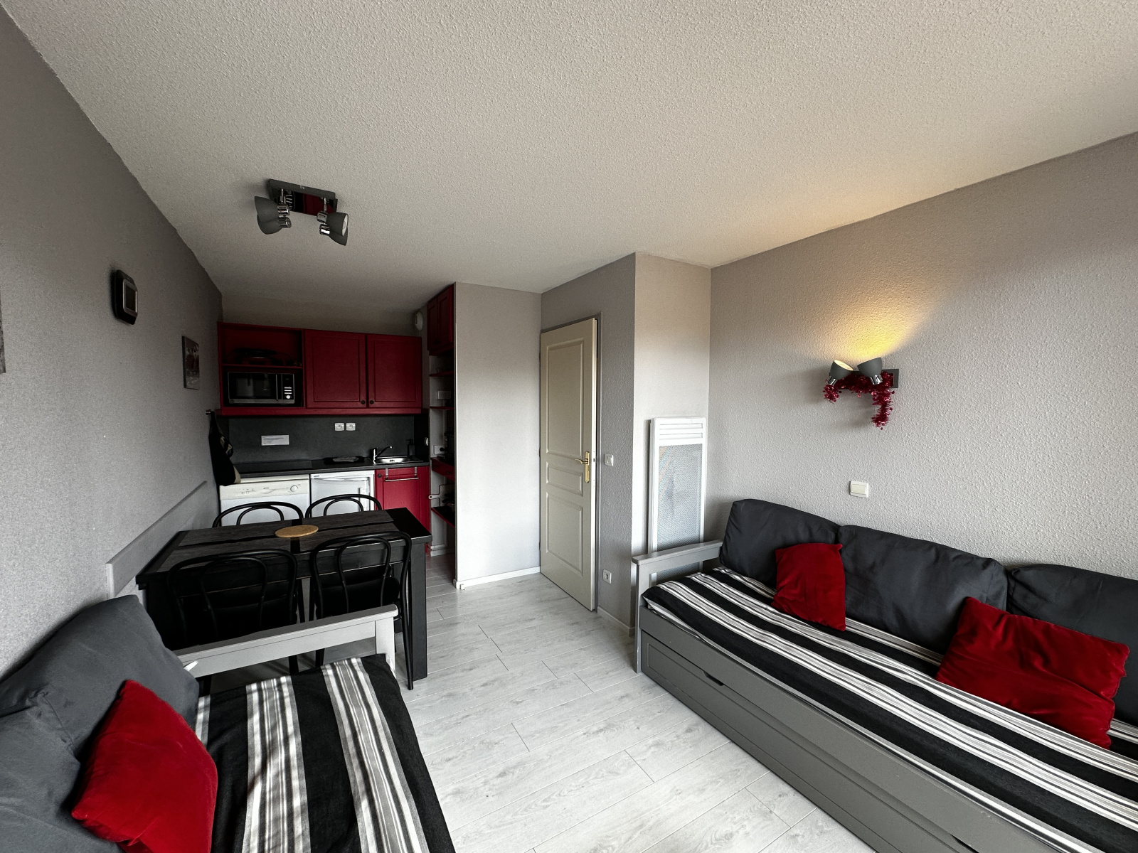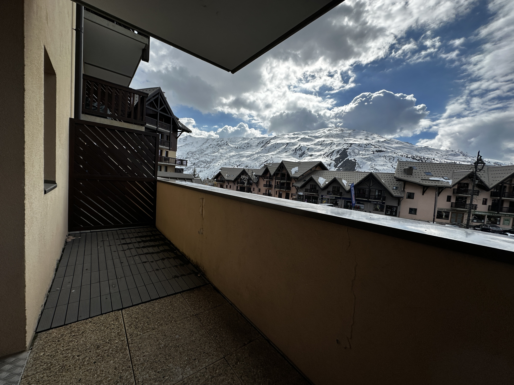L'appartement comprend une entrée avec rangement, une salle de bains, un WC séparé, une chambre avec rangement, un séjour avec cuisinette donnant sur un balcon terrasse exposé Sud-Ouest. L' appartement est vendu libre de toute location et occupation. Un casier à skis situé au RDC de la résidence vous permettra de ranger vos skis et chaussures.