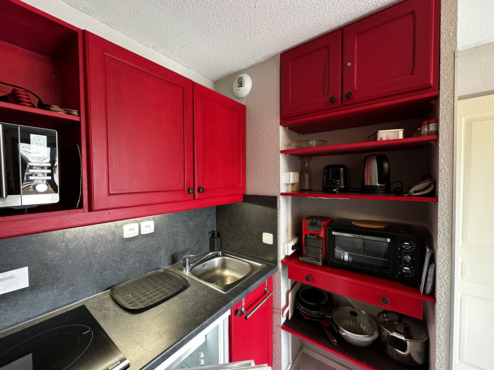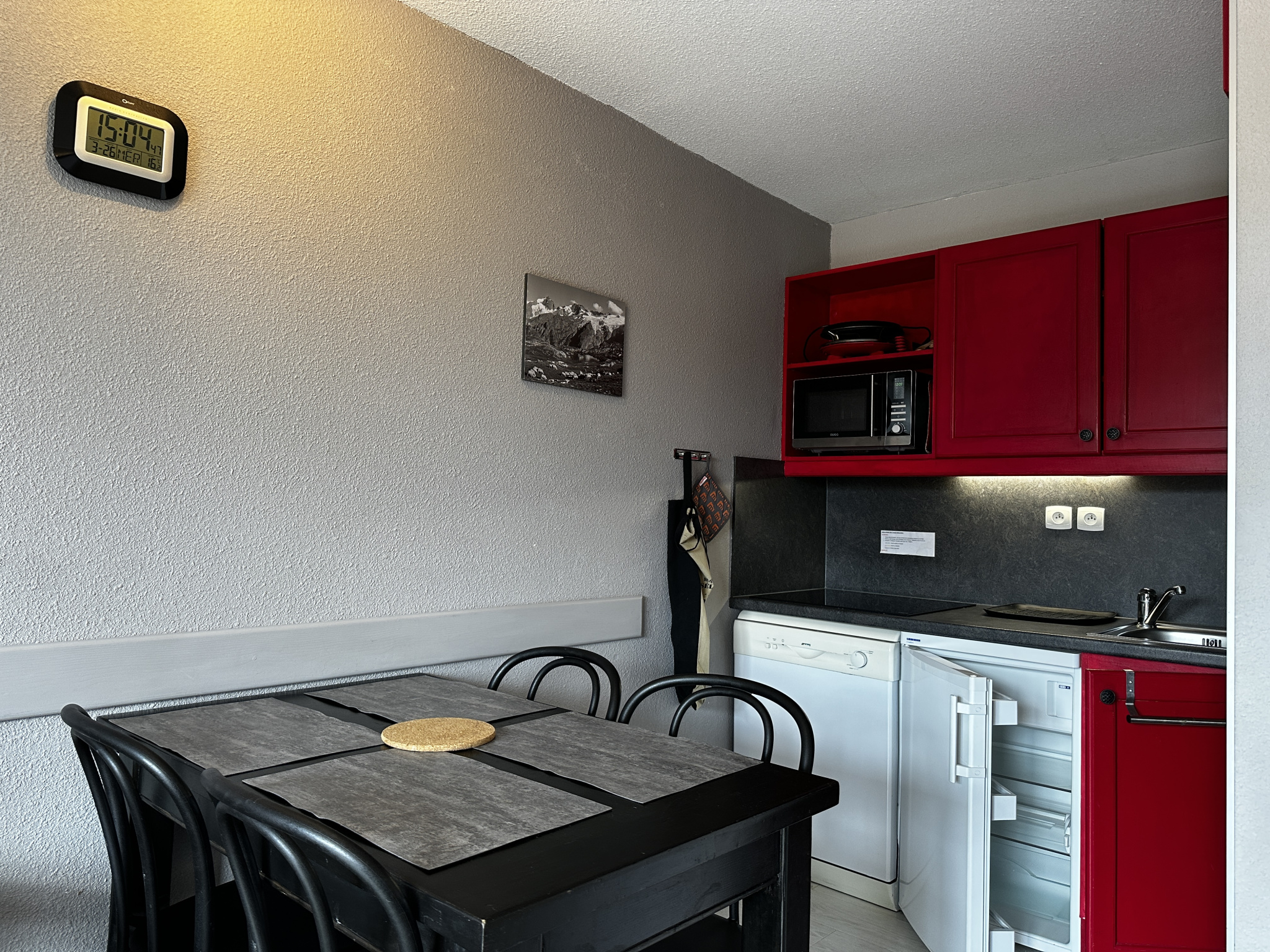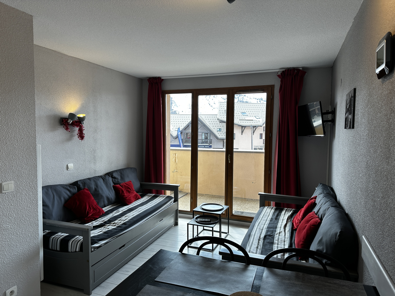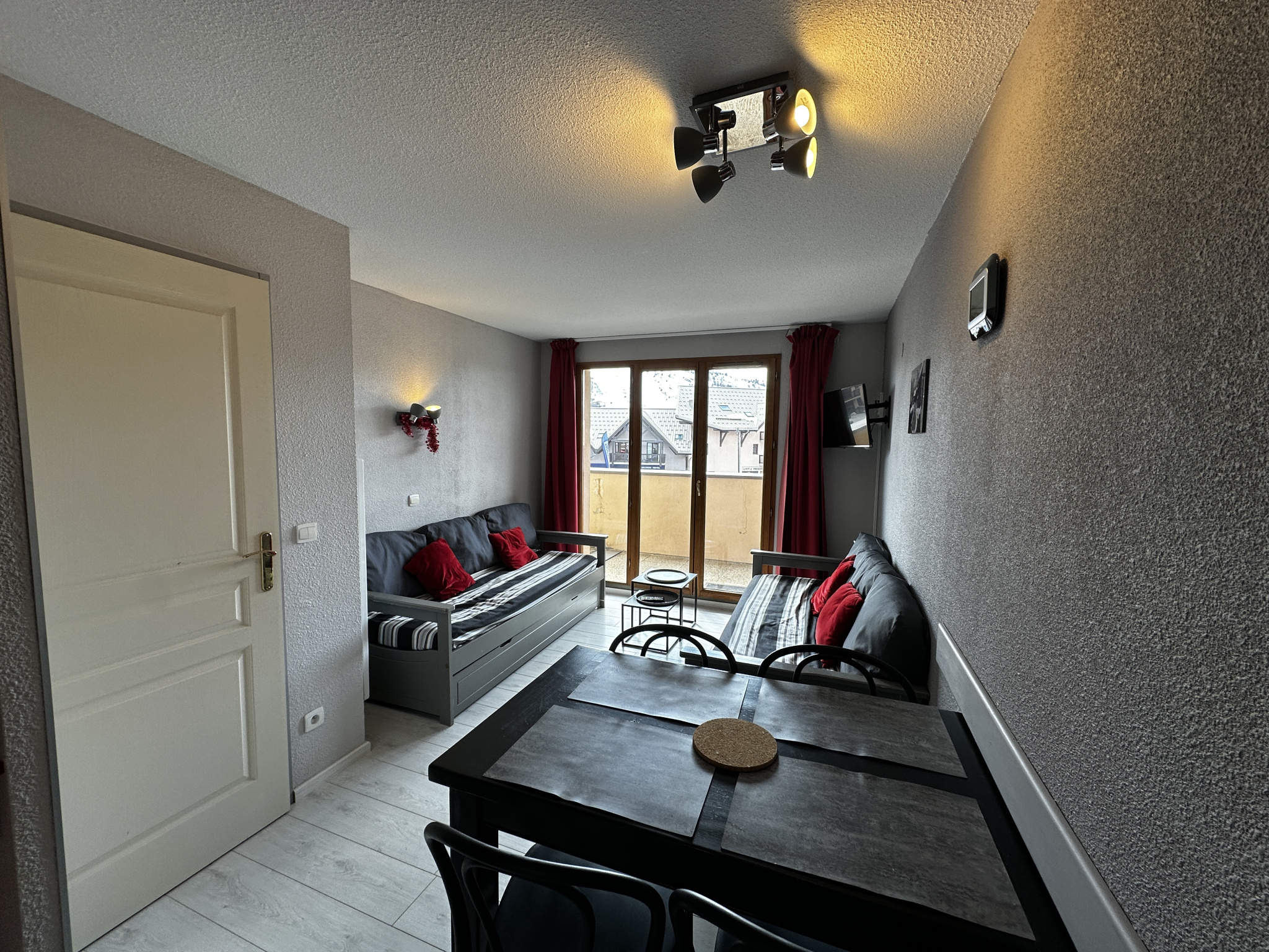 L'appartement comprend une entrée avec rangement, une salle de bains, un WC séparé, une chambre avec rangement, un séjour avec cuisinette donnant sur un balcon terrasse exposé Sud-Ouest. L' appartement est vendu libre de toute location et occupation. Un casier à skis situé au RDC de la résidence vous permettra de ranger vos skis et chaussures.