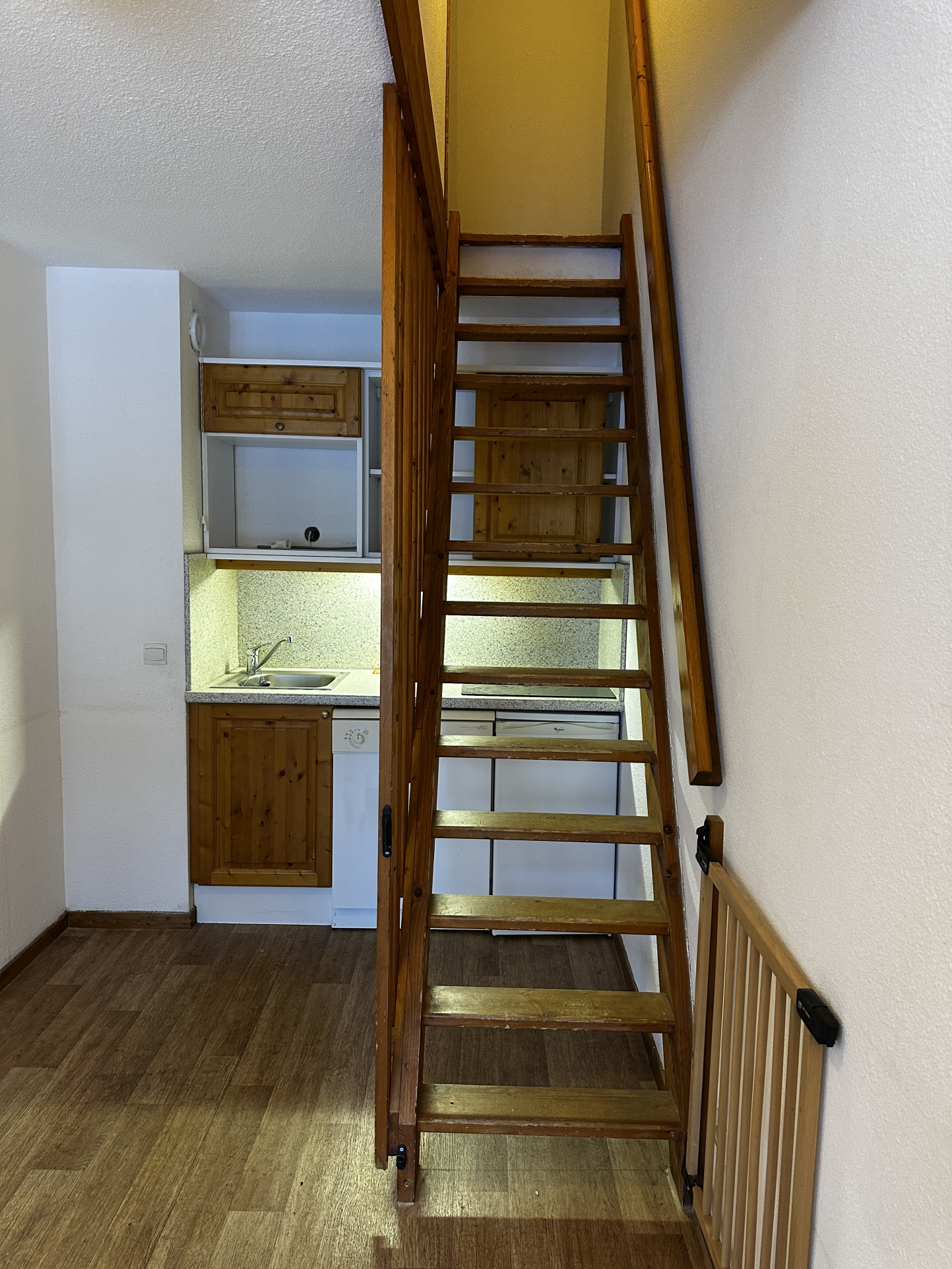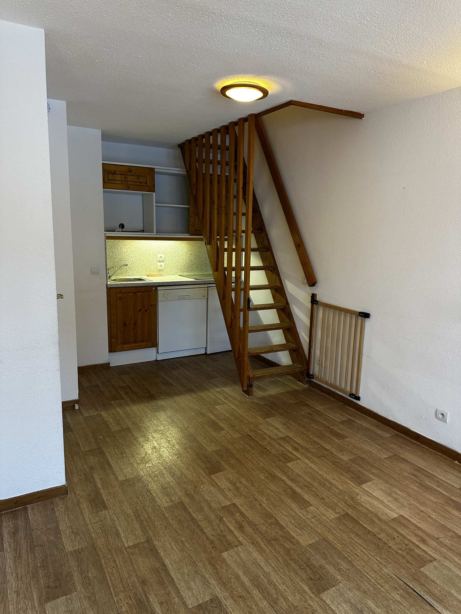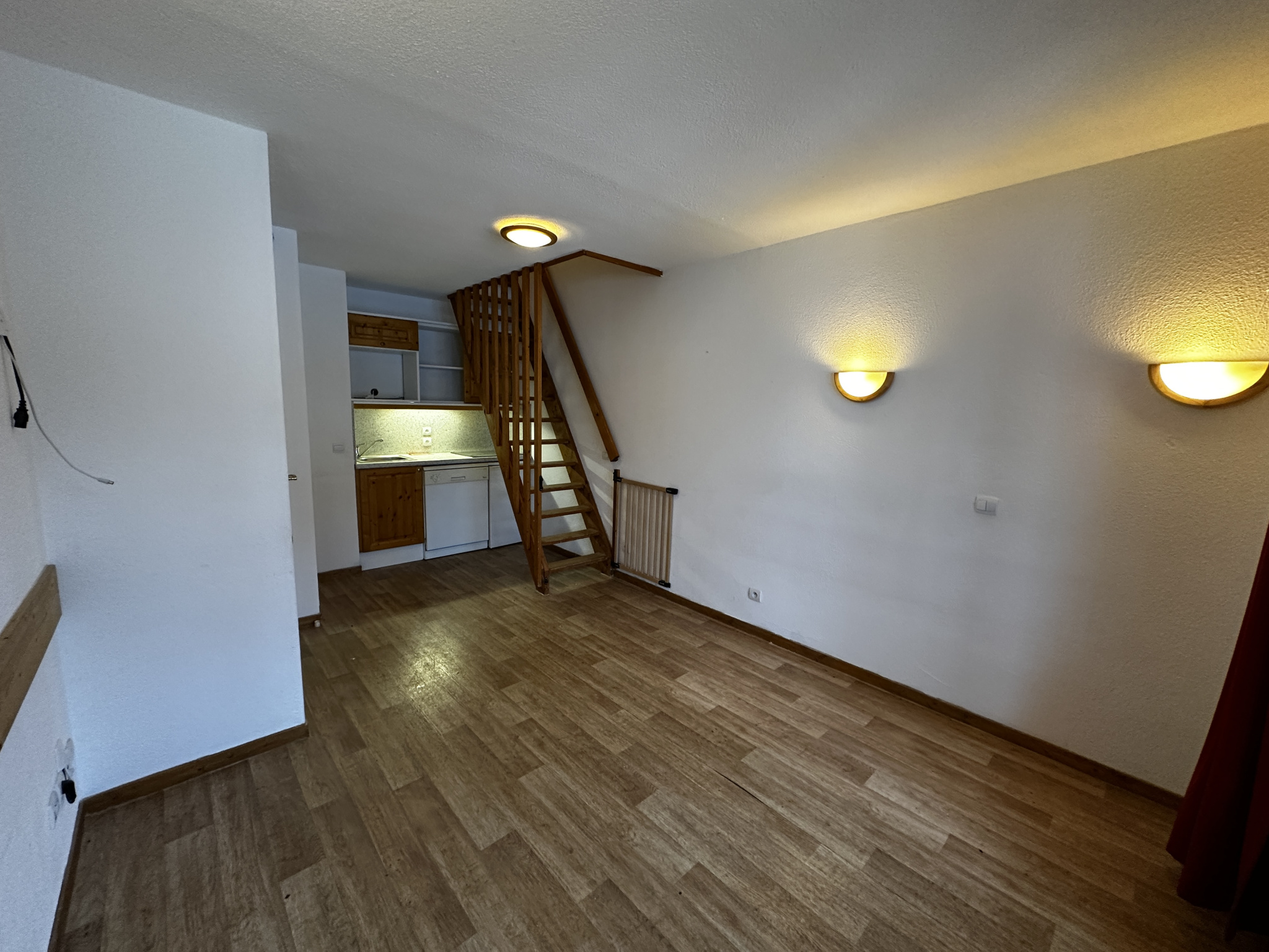 Duplex comprenant une entrée avec rangement, une chambre, une salle de bains, un Wc séparé, d'un séjour avec cuisinette et d'un escalier amenant à l'étage supérieur où se trouve une grande chambre en mezzanine et sous les toits avec une salle d'eau. Ce bien est vendu vide de mobilier.