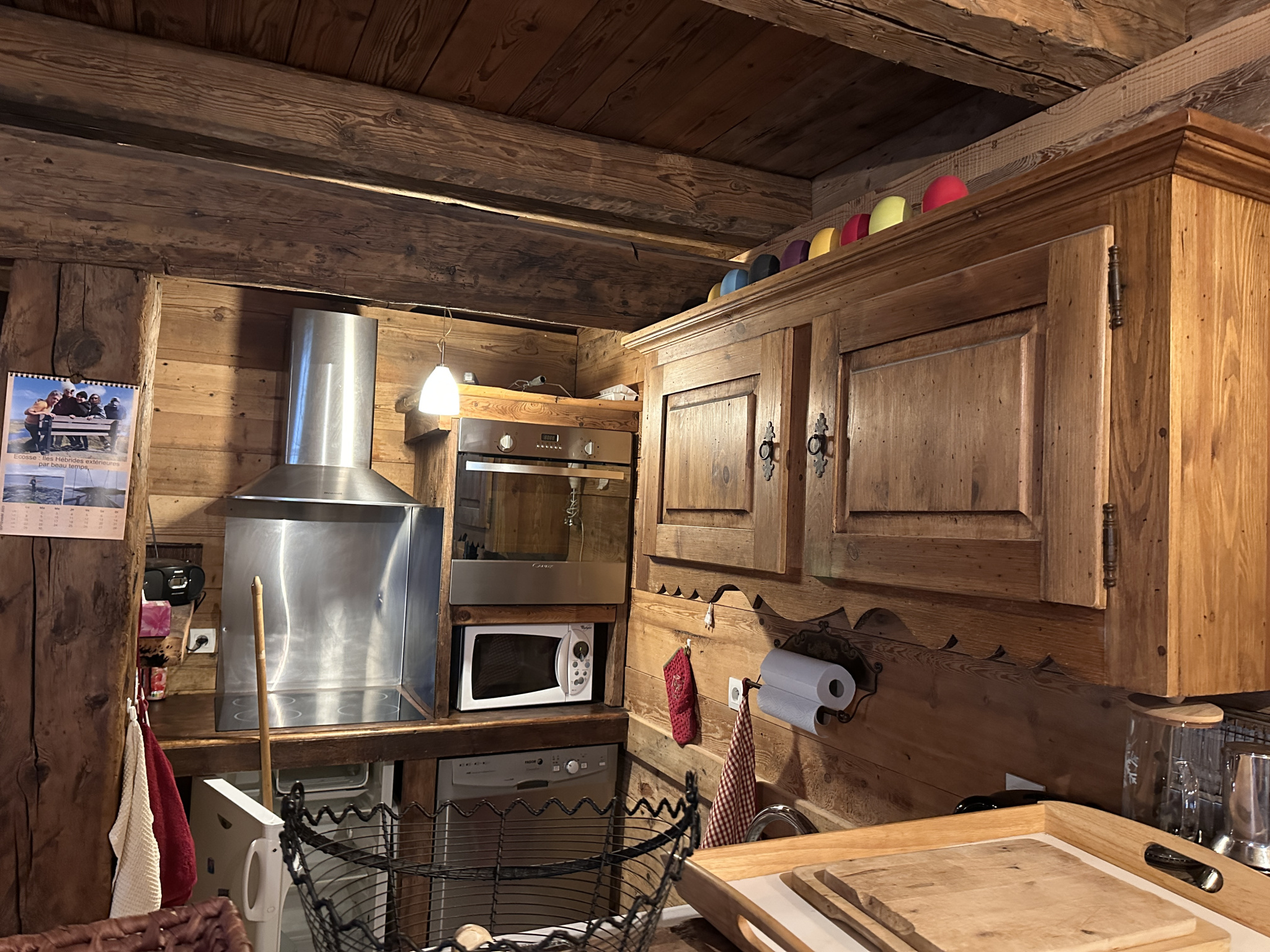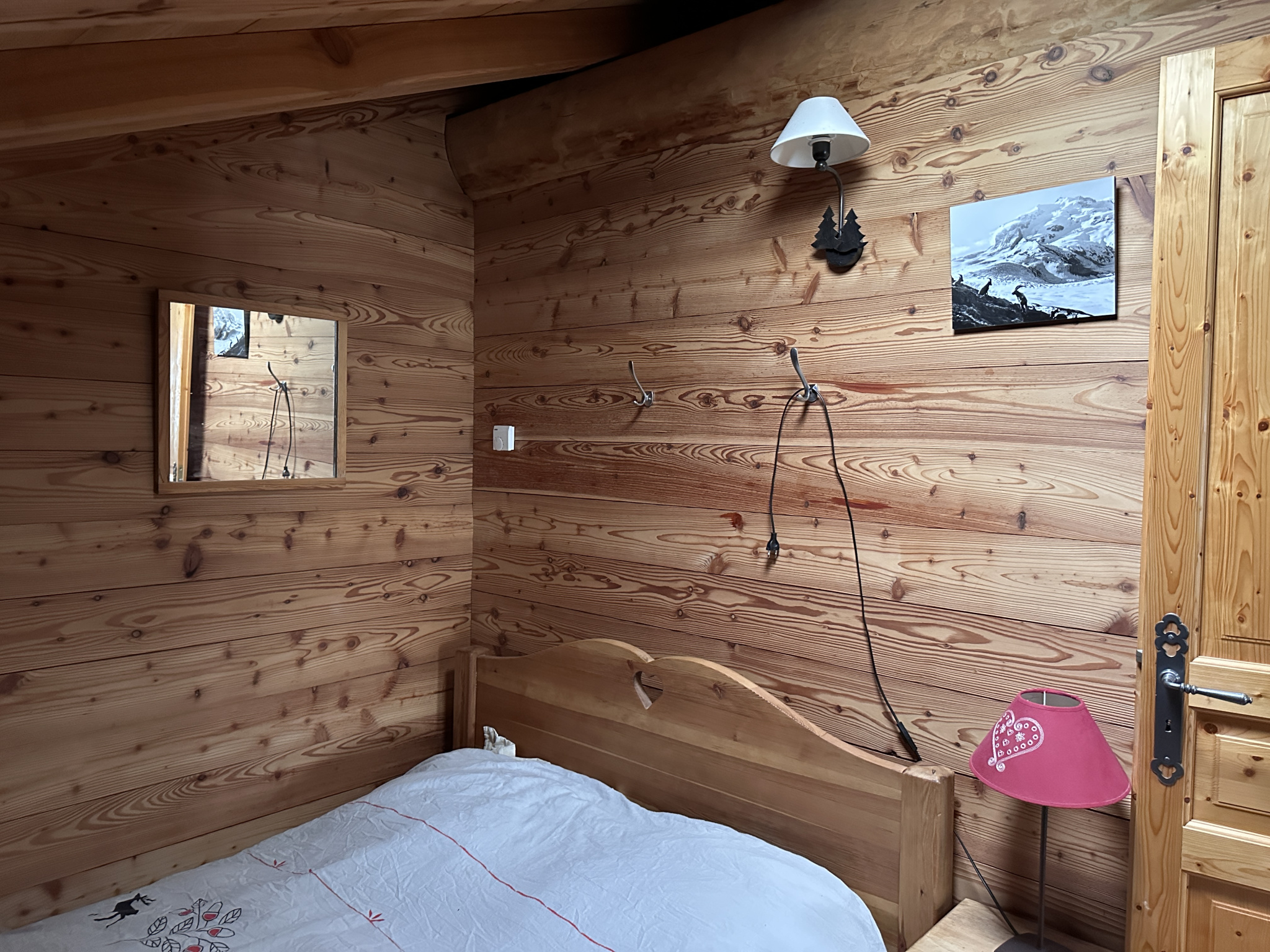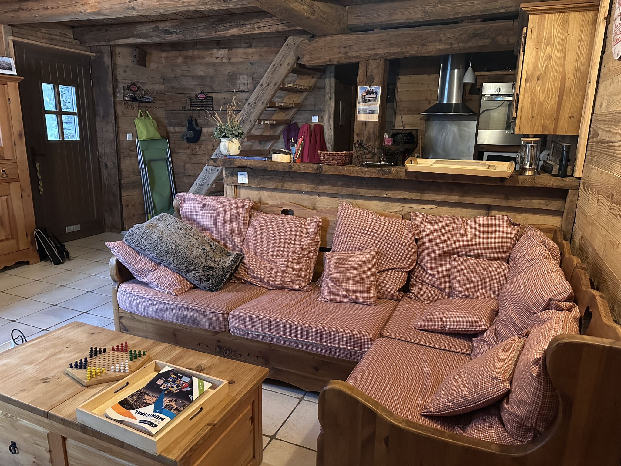 au niveau 1: une entrée, un séjour avec cuisine, une chambre, une salle d'eau avec WC, et un escalier intérieur amenant à l'étage supérieur. La terrasse en bois devant le chalet est l'accès principal à l'entrée du chalet.